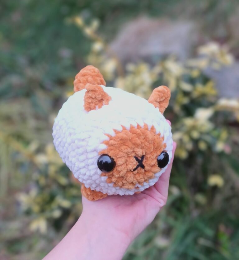 Ručně háčkovaná kočička z akrylové příze, plastová očička. Bílo hnedá.