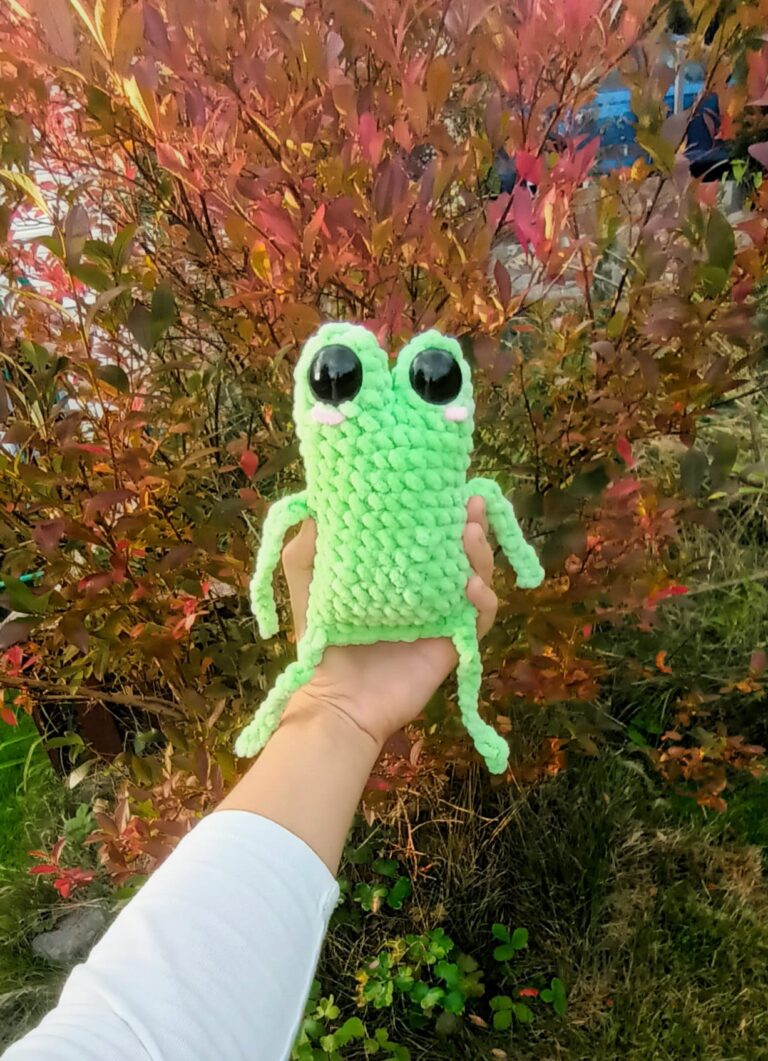 Ručně háčkovaná žabička z akrylové příze, plastová očička.